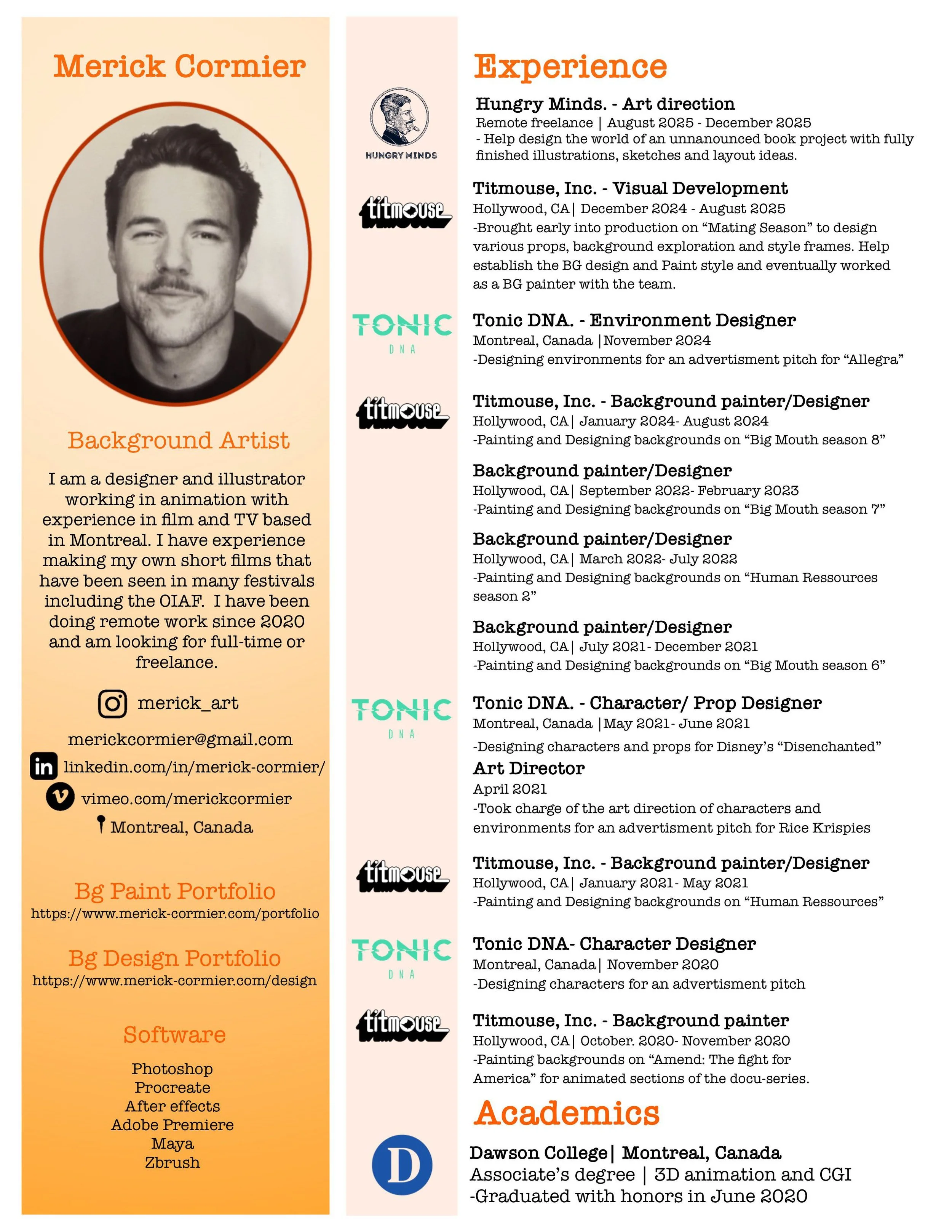 Hello! I am a designer and illustrator working in animation with experience in film and TV based in Montreal. I have been doing remote freelance visual development and background art on multiple projects since 2020. I had the chance to work on commercials, a multi-episode Netflix documentary, Disney’s Disenchanted (2022), Human Resources Season 1 and 2 (Netflix), Big Mouth season 6, 7 and 8 (Netflix), Mating Season season 1 (Netflix). During my free time I create my own short films. I am always looking for next project so feel free to reach out.